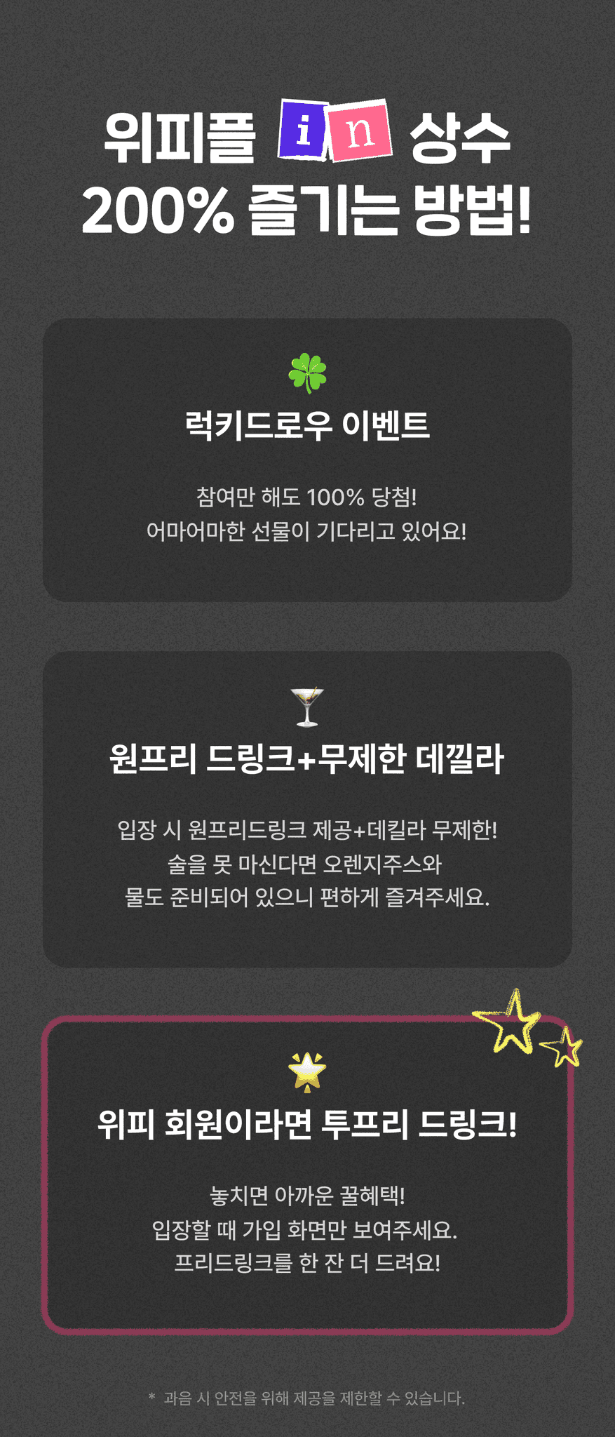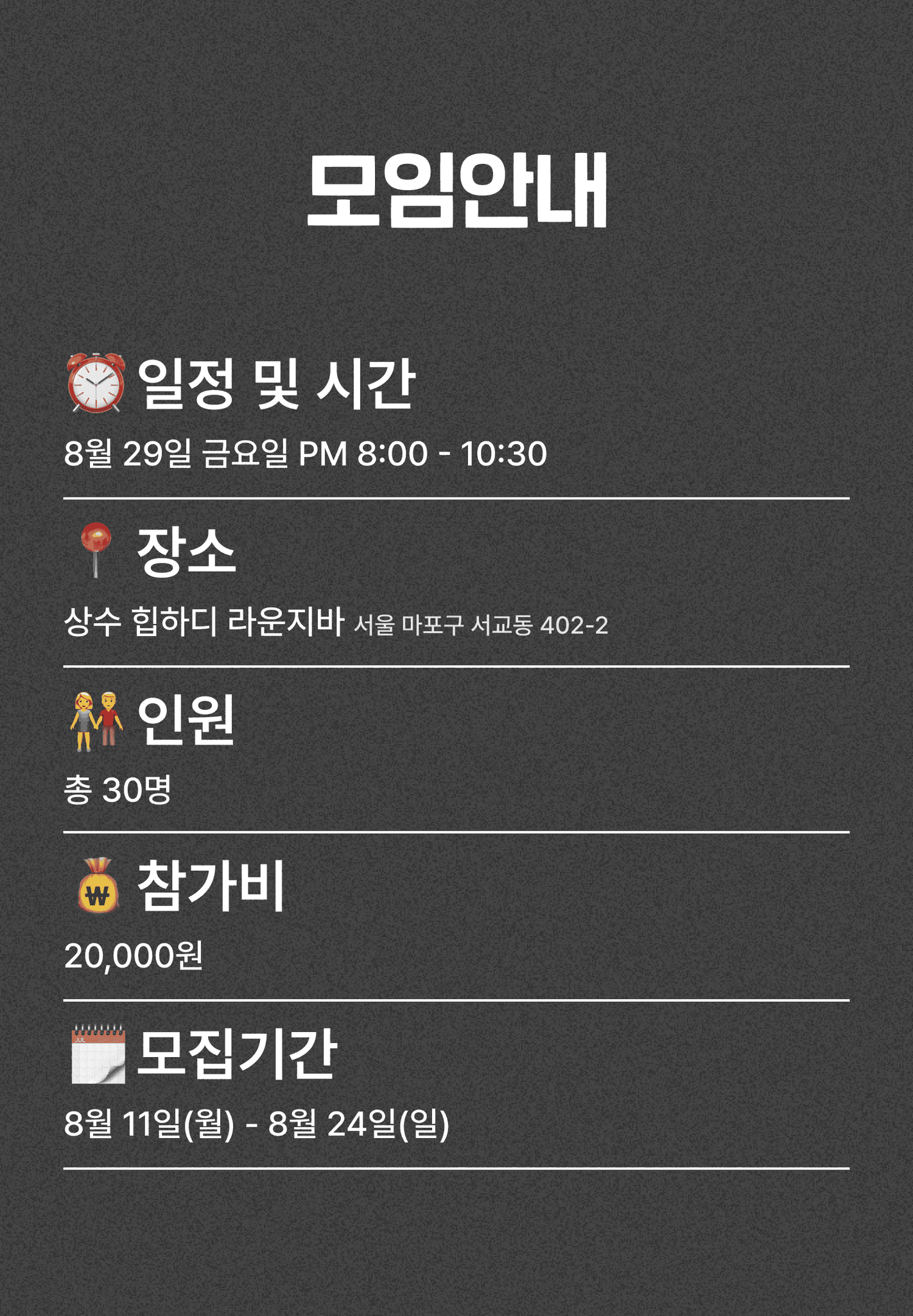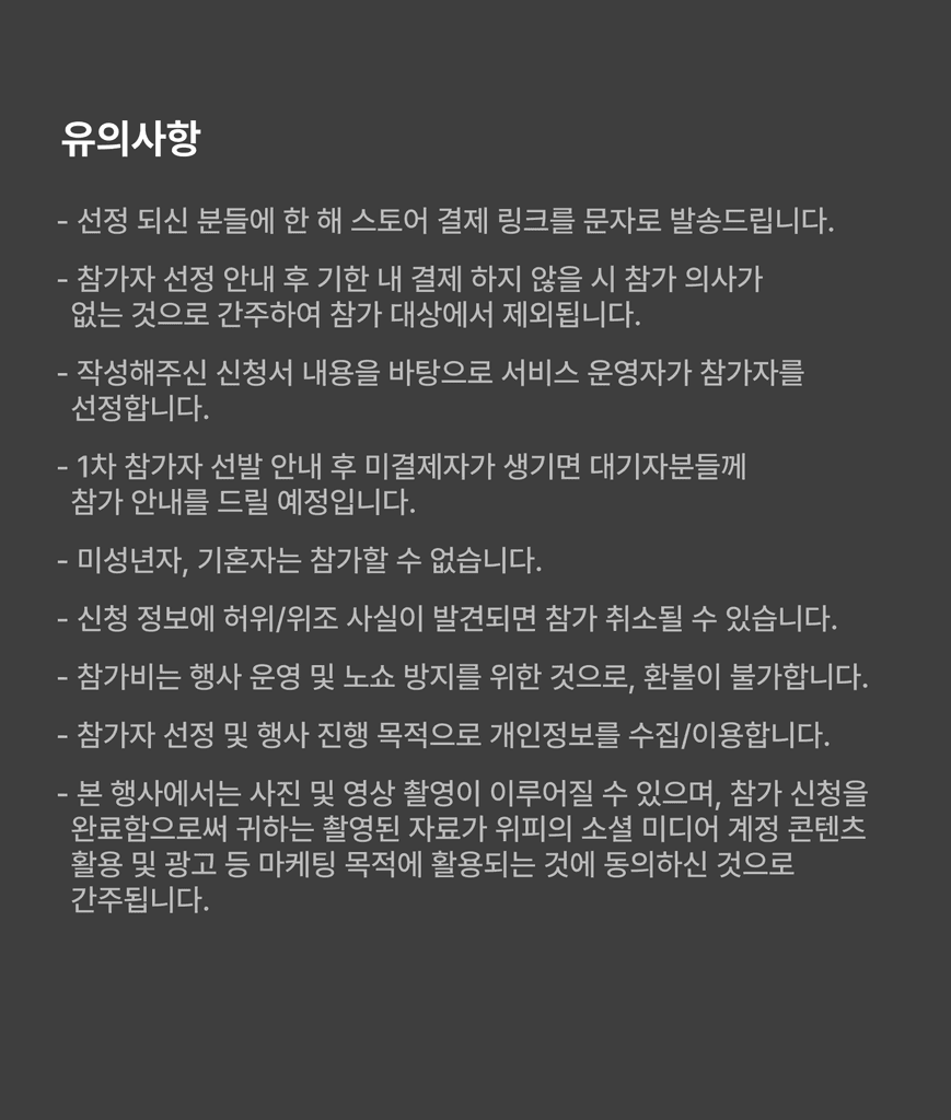 개인정보를 모임을 위한 당첨 선별 정보로 활용하며, 목적 외의 용도로는 사용하지 않습니다.